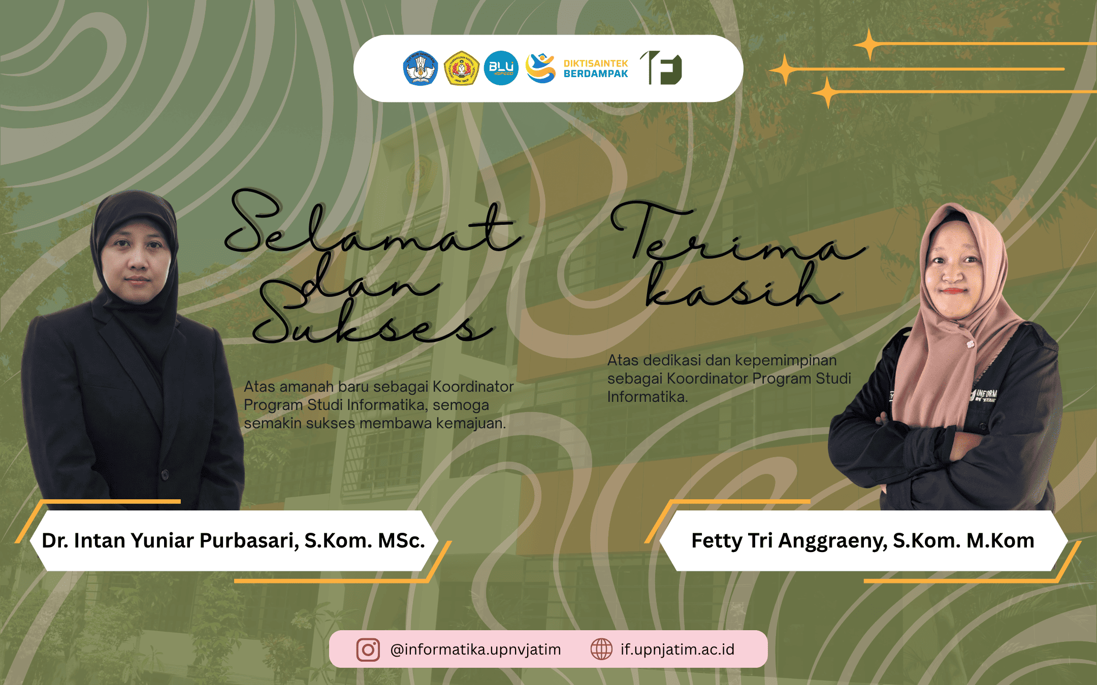 Perubahan kepemimpinan dalam lingkungan akademik merupakan bagian dari dinamika organisasi yang mencerminkan keberlanjutan dan pengembangan institusi. Program Studi Informatika UPN “Veteran” Jawa Timur menyampaikan apresiasi dan penghargaan setinggi-tingginya atas dedikasi serta kontribusi yang telah diberikan oleh Koordinator Program Studi sebelumnya dalam memajukan kualitas pendidikan, pengelolaan akademik, serta penguatan tata kelola program studi. Selama masa pengabdian, berbagai capaian strategis telah berhasil diwujudkan, baik dalam aspek peningkatan mutu pembelajaran, pengembangan kurikulum yang adaptif terhadap kebutuhan industri, maupun penguatan budaya akademik yang kolaboratif dan inovatif. Kontribusi tersebut menjadi fondasi penting dalam mendukung keberlanjutan dan daya saing program studi di tingkat nasional maupun internasional. Seiring dengan estafet kepemimpinan, Program Studi Informatika juga menyampaikan ucapan selamat kepada Koordinator Program Studi yang baru. Amanah ini diharapkan dapat membawa semangat baru dalam mendorong transformasi pendidikan berbasis teknologi, memperkuat sinergi dengan berbagai pihak, serta menghasilkan lulusan yang unggul, kompeten, dan siap menghadapi tantangan global. Dengan semangat kolaborasi dan keberlanjutan, diharapkan kepemimpinan yang baru dapat melanjutkan serta mengembangkan capaian yang telah dirintis sebelumnya, sehingga Program Studi Informatika terus berkembang menjadi pusat pendidikan yang inovatif dan berdaya saing tinggi.