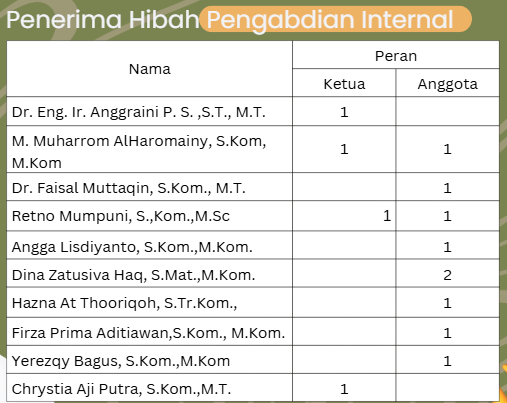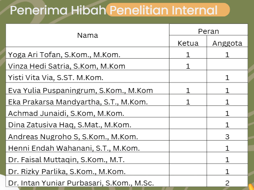 Dalam pengumuman resmi, sejumlah dosen ditetapkan sebagai penerima hibah dengan peran beragam, baik sebagai ketua maupun anggota tim penelitian dan pengabdian. Nama-nama yang tercantum mencerminkan kolaborasi lintas bidang keilmuan, mulai dari teknologi informasi, sistem komputer, hingga pengembangan masyarakat berbasis digital.